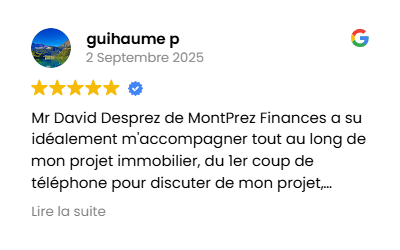Chez MontPrez Finances, la confiance de nos clients est notre plus grande récompense. Chaque projet de financement immobilier est une histoire unique, et nous sommes fiers d’avoir été le partenaire de choix pour de nombreux individus et de nombreuses familles. Voici ce que nos clients satisfaits ont à dire sur leur expérience avec MontPrez Finances, courtier en prêt immobilier sur la Haute Savoie.